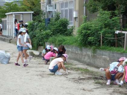 そして,11:05より外へ出て,校舎周りや運動場・花壇で,除草やごみを取り除く作業に汗を流しました。また今回,長年手が付けられてなかった運動場周囲の側溝の掃除も行いました。時間が限られていたので,一部しかできていませんが,それでも有志の6年生が手伝ってくれたので,西側花壇前の側溝はきれいにすることができました。これから予定されている紫竹祭りや学校・学区の運動会等に備えて,継続的に取り組み,きれいにしていきたいと思います。