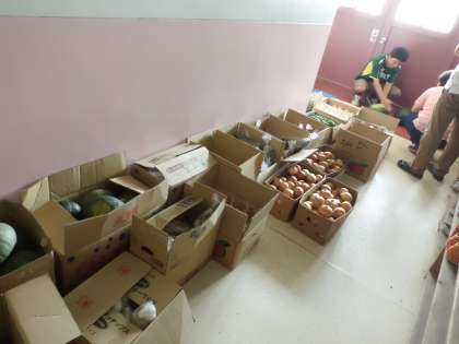 午前中の時間を活用して,紫竹まつりの会場設営等の準備が着々と進められています。色鮮やかな各ブースのテント,これから華やかな演技や演奏が繰り広げられるステージ,イベントのスタートとなる取組のバザー等の準備が進めらています。そして学校教職員も販売する野菜の仕分け作業を入念に進めています。