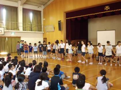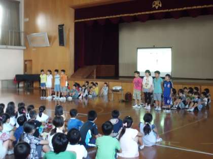 9月9日(火)8時30分より児童朝会を行いました。今回は,4年生の感動体験発表があり,7月16日から2泊3日で行った「奥島みさきの家宿泊野外活動」について,思い出をスライドの映像と共に,発表してくれました。