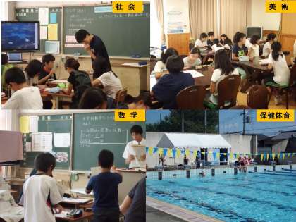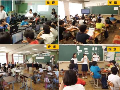 前半は,各教室に分かれて国語・社会・数学・理科・音楽・美術・保健体育・技術・英語・1組の学習を体験しました。
