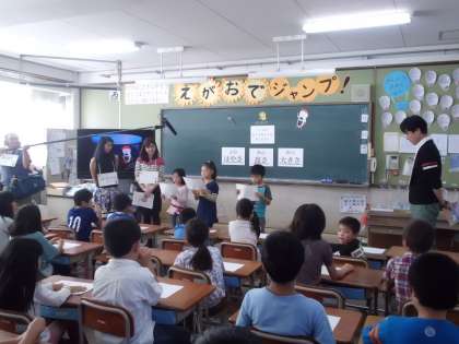 3人のアナウンサーの方のすばらしい読み声をきき,物語の山場の場面をクック,テンテ,ナレーターに分かれて,子どもたちが読んでいきます。進んで手を挙げ,しっかり声を出し,声の大小,抑揚を工夫して表現豊かに読み上げる子どもたちの姿に,アナウンサーの方からたくさんのおほめの言葉をいただきました。