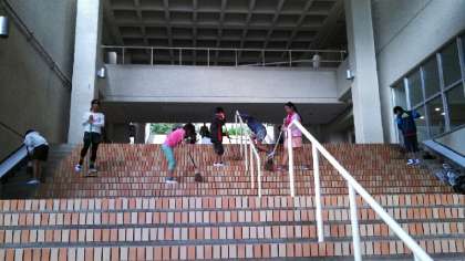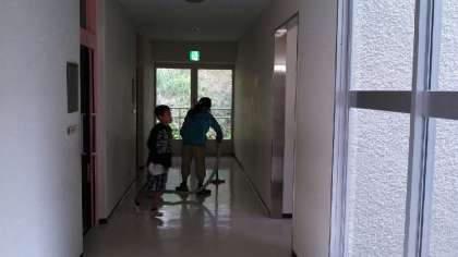 分担して掃除をしました。大階段,1棟廊下,1・2棟洗面所などを