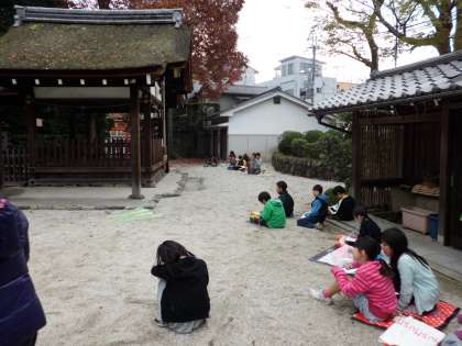 昨日,久我神社にスケッチしに行きました。今までに何度も行ったことがある場所でも,いざ絵を描くとなると,難しいというつぶやきが聞こえてきましたが,描き始めると集中して社を見つめ,細かい部分まで丁寧に描いていました。