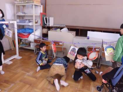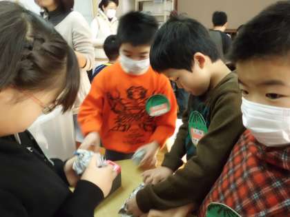 今日は,上賀茂小学校で合同作品つくりをしました。久しぶりに集まったみんなの顔は,ニコニコで,「さあ,今年は何を作るんだろう!」とワクワクでした。今回は,「まとあて」です。新聞紙を丸めてボールを作り,仮面ライダーのお面や音がするまと,おばけのまとなどにあてて楽しみました。次回は,自分たちが作ったまとをもちよります。帰り道,「どんなまとを作ろうかな?」と相談しながら学校にもどってきました。