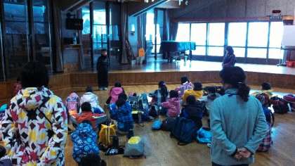 お話,花背山の家の先生のお話を聞きました。そしてそり遊びの注意を聞