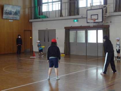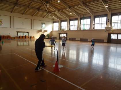 次は,二つのチームに分かれて三角ベースの試合をしました。打って走るが上手になってきたたいよう学級の子どもたち。教師塾の先生は,「どこにボールを持って走るか迷ってしまいます。みんなはやく走るのでタッチできません!」と言ってもらいました。