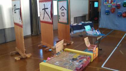 たいよう学級は,学校生活での楽しかった場面を絵に表した平面作品と,人権学習で作製した,朝鮮半島に伝わるお面「タル」を展示しました。