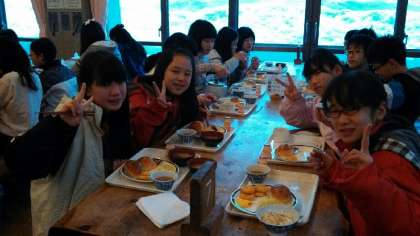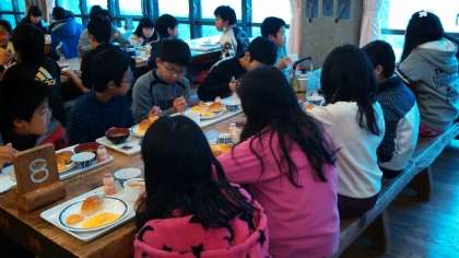 朝の集いの後、朝食をとりました。洋食はパン,マーガリン,