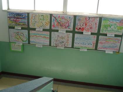 絵の具を使って,自分で色を作っていろいろな線をかいてみました。ぐるぐる線,細い線,水たっぷりの線,…いろんな線でいろんな世界が広がりました。