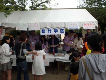 紫竹学区のブースでは「カレーライス」「アメリカンドッグ」「フライドポテト」の販売が行われ大変,賑わっていました。また,子どもたちの遊びコーナーの「スーパーボールすくい」のブースは北上・北下支部PTA連絡協議会が担当され,たくさんの子どもたちがやってきて,スーパーボールすくいを楽しんでいました。