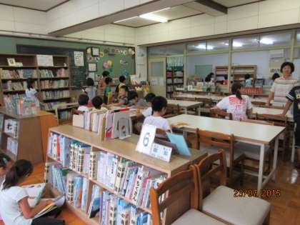 この日の4校時,3年生とたいよう学級の児童が図書室を訪れ,夏休みの読書や自由研究,調べ学習に必要な本を選び,借りにたくさん来ていました。