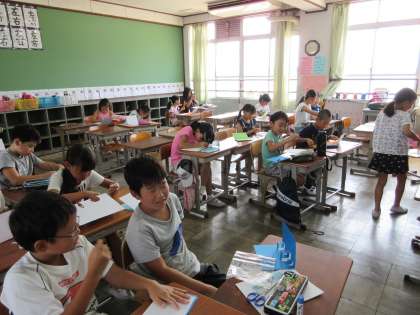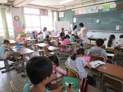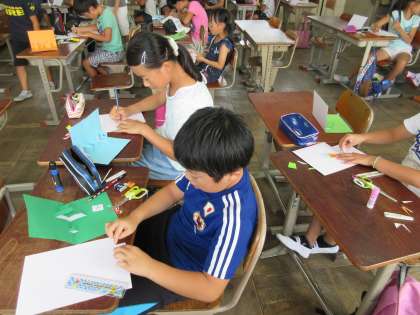 8月3日(月)4年生の登校日です。9時に教室に20人の子どもたちが集まりました。先週で7月が終わり,プール開放水泳教室も終わりました。これまでの楽しかった夏の思い出を話し合い,「とびだすカード」につくって表現する活動を進めました。