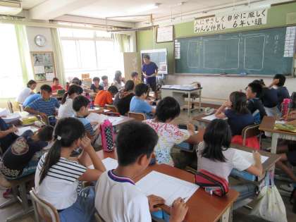 この日は,前回の授業や家庭学習の内容をもとに,作文の構想を立て,文章作成にとりかかるという段階です。「社会を明るくする」というテーマの基準が高いと感じたり「犯罪や非行のない」という状態が,身近に感じにくかったりする子どももおり,なかなか鉛筆が走ろうとしませんでしたが,教師の助言や友達との意見交流で少しずつ,書き始められるようになっていきました。