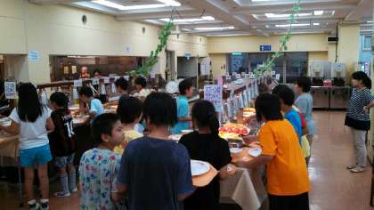 カッター体験で体力を使ったのでしょう。子どもたちの食欲か旺盛になってきました。夕食のバイキンクメニューはビーフンサラダ、イカボール煮物、豆とモヤシのペペロンチーノ、ビビンバ焼きうどん、メンチカツ、さんま柳川風、お吸い物、フルーツゼリーなどからたくさんおかわりして完食していました。