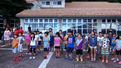 7時より集会広場で朝の集いに参加しました。一緒に宿泊している大学生たちと一緒に、朝のあいさつ、学校紹介、ラジオ体操等、行いました。