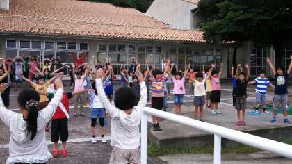 おはようございます。三日目の朝を全員元気に迎えました。朝の会は昨日から宿泊されている開晴小学校の友達とも一緒です。旗の掲揚、一言コメント、学校紹介を代表児童が務めました。そして、ラジオ体操で体をほぐしました。