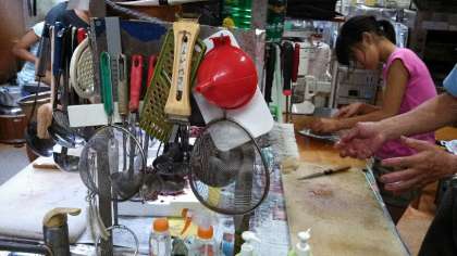 男女わかれて、「はまべや」「まつみや」の各民宿に分かれて入らせていただきました。最初の活動は干物作りです。アジを三匹、民宿の方に教えてもらって包丁で開きます。初めての経験でなかなかうまくいかなかったですが、みんな一生懸命にチャレンジしました。明日のお土産になります。