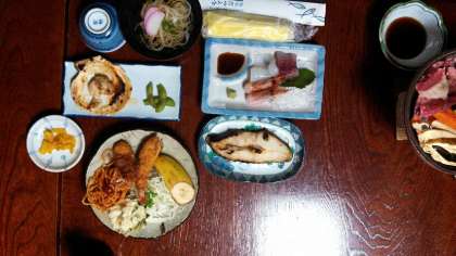 男子が宿泊している民宿の夕食の様子です。若狭の新鮮な魚介類中心にハマチ、イカ、甘エビなどのお刺身、エビフライ、牛肉、野菜の陶板焼き、カレイバター焼き、にゅうめん等、豪勢なご馳走でした。