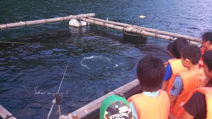 朝食の後、港へ出て、2グループに分かれて海岸での魚釣りと船に乗って養殖魚のえさやりをしました。海での初めての体験に子どもたちは生き生きと活動していました。