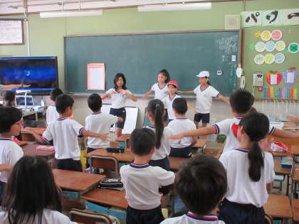 運動会の準備運動係の子どもたちが,朝学習の時間に分担して各学級に行き,準備運動を教えてくれます。
