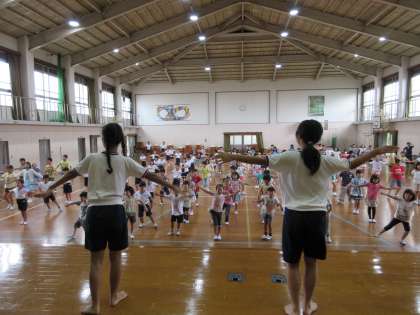 9月10日(火)中間休み,これまで各教室で準備運動の練習を進めていましたが,この日は1年〜3年生とたいよう学級の児童が体育館に集まって,舞台の上で係の児童が演じながら進めました。