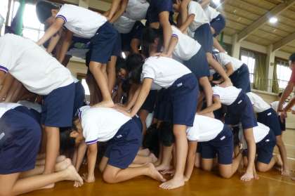 今日は5・6年総勢73名で大ピラミッドの大技に挑戦しました。