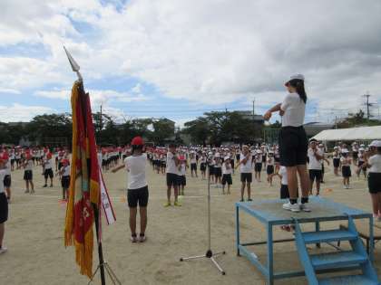 開会宣言,校歌斉唱,優勝旗・トロフィ変換,校長先生のお話,児童代表の言葉,応援団リーダーシュプレヒコール,そして全員で準備体操をしました。