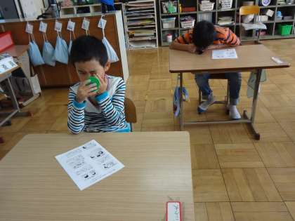 今日は,1時間目の保健指導に教育実習の北村先生が10月の保健指導に来られました。「10月10日は目の愛護デー」目の名称や目にいいことを教えてもらいました。眉毛・睫・瞼・瞬きを教えてもらった子どもたちは,鏡を見ながら確認しました。