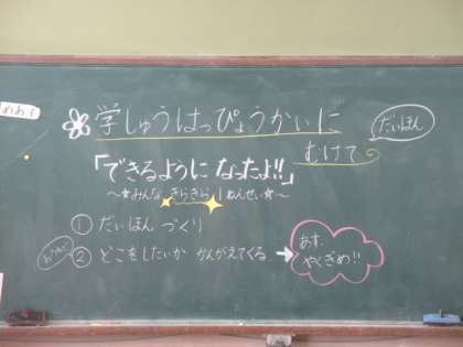 「きらきら」をもう一度みんなで確認し学習発表会を通して更に一歩,「きらきら」1年生になろうねと話をしました。学習発表会の目標は「体育館にひびく 大きな声で」「見ている人が楽しくなる にっこりえがお」「1年生みんなで ちからをあわせよう」です。運動会の練習を通してぐっと成長をした1年生。次は学習発表会で更にステップアップできるようにこれから練習をがんばっていきます。