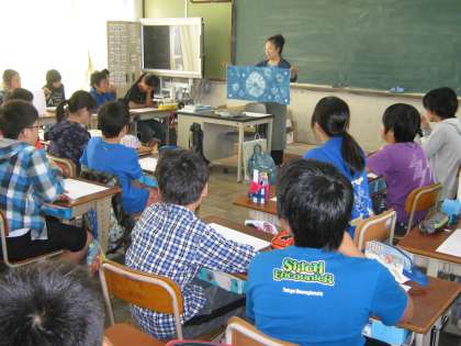 14日(水)の4・5・6校時,ゲストティ—チャーの高須先生に来ていただき,藍染体験を行いました。
