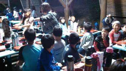 一日目の夕食を東屋でいただきました。トンカツとスパゲティ、タケノコとニンジンのカレー煮、春雨サラダとゼリー、ご飯、味噌汁です。たくさん活動したので、みんなたくさんおかわりをしていました。
