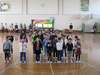 4年生は,6年生に「夢」をたずね答えてもらうというやりとり入れたコールでお祝いしました。そして「栄光の架け橋」をはなむけに歌いました。