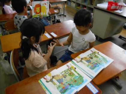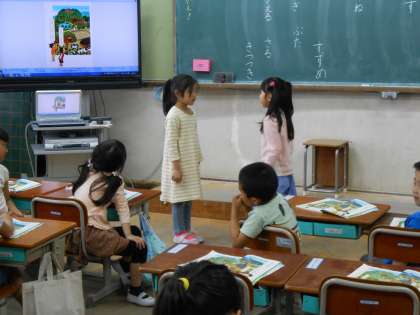 国語の学習では,『えをみてはなそう』という単元で,絵を見て「なにがいますか。」「〜がいます。」というように二人で話し方を学習しました。