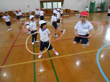 「もうじゅうがり」やフラフープを使っていろんな遊びをそれぞれが考えてできました。