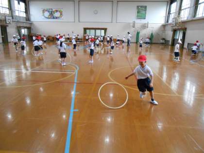 体育の時間,体育館でみんなで元気いっぱい体を動かしました。