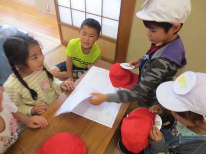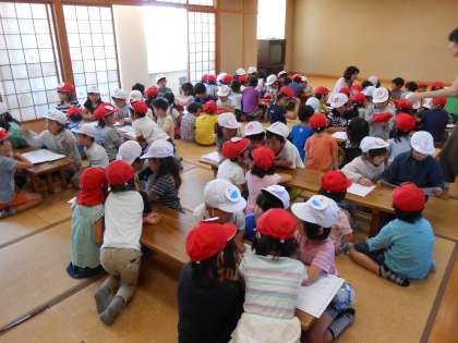 当日は,赤白帽子につけて行きます。心のこもった,とてもあたたかいバッジでした。遠足のコースやポイントについての説明があり,その中で,みんなが迷子にならないようにするため確認をするなど,和やかな雰囲気で交流をしました。あさっての遠足も,みんなで協力し合い,楽しく過ごせたらいいなと思います。
