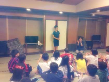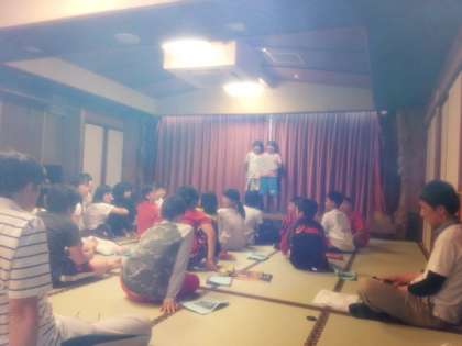 夕飯の後はお楽しみ会、反省会です。7グループがそれぞれ考えた出し物を披露し、大変盛り上がりました。反省会では、引率の先生方から、今日1日の良い点悪い点を話していただきました。明日に生かすことを確認して,今日1日を終わりました。