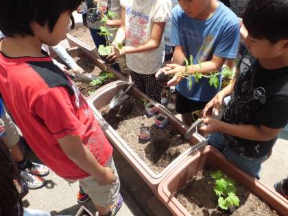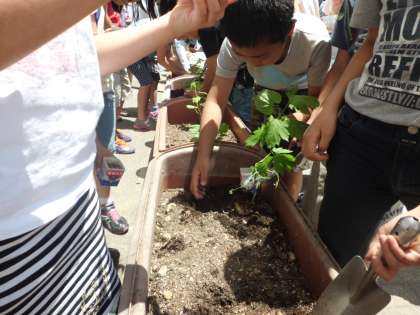 4時間目の理科の学習で,ツルレイシをプランターに植えかえました。