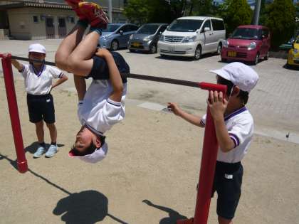 3年生は体育科で「てつぼう」の学習をしています。友だちとペアになり,お互いの技を見合って,「もう少し足をあげた方がいいなあ。」「上手!」など声を掛け合いながら頑張っています。