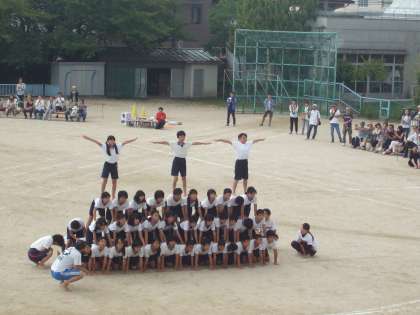 組体操の最後はみんなで力を合わせる技が、いくつかあります。これまで、絶対にケガをしないように、何度も何度も繰り返してきたタワーや大きなピラミッドは、大成功でした。今まで、同時に7つのタワーが立つことは、ほとんどなかったのですが、本番ではしっかりと決めて見せてくれました。子どもたちの底力を感じました。