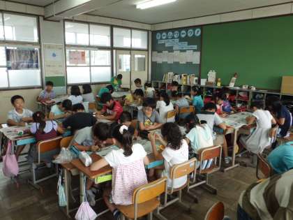 少し時間が経ってしまいましたが,6時間目の図工の時間に,みさきの家の思い出を作りました。2日目のいそ観察時に宮崎浜で拾ってきた平たい石に,カラーテックスで模様や絵,文字を描きました。