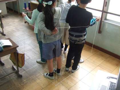 5月1日(木)の算数「体積」の学習で,1立方メートルはどのくらいの大きさなのか,実際に1立方メートルを紐で作って調べる活動をしました。4人がすっぽりと入る大きさだったので,「思っていたよりも大きいんだな」と驚いていた子たちが多かったようです。