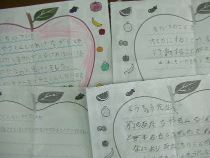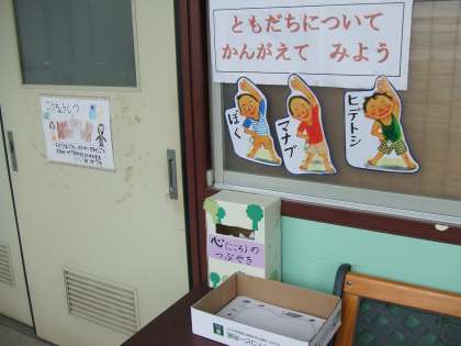 2日の人権朝会では,「ともだちやもんな ぼくら」という絵本を読みました。この絵本は,ぼく,マナブ,ヒデトシの3人が,カブト虫を捕まえようと近所の木に登り,カミナリじいさんにしかられます。そして,逃げ遅れた友達を巡っての出来事を通じて,友情を深めていくというお話です。この話をきっかけにして,それぞれの教室で「友だちを大切にすること」「本当の友だちとは」について話合いました。そして,今年は子どもたちの思いや考えを「心のつぶやき」として聞いてみたいと考え,校長室前にの投稿箱を用意しました。さっそく,何人かの子どもが「心のつぶやき」を投稿してくれてうれしいです。カードは,後日校長室前に掲示する予定です。
