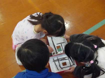 秋の自然のものを使っておもちゃ作りをし、そのおもちゃで「秋を楽しむ会」として紫野保育園年長さんを招いて行いました。
