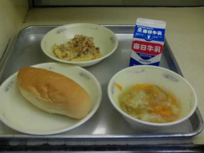 今日の献立は、コッペパン(国内産小麦100%)・牛乳・ペンネの豆乳グラタン・野菜のスープ煮です。