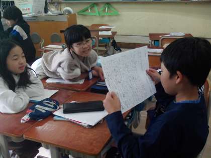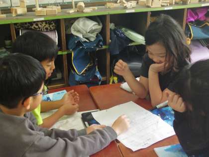 2時間目に、おもしろいと思った行動や様子、出来事を、そう思った理由を添えて書きまとめました。そして、3時間目に書きまとめたものを、グループ内で、自分の思いや考えをもって伝え合いました。