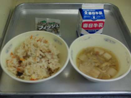 今日の献立は、炊き込み五目ごはん・牛乳・みそ汁・じゃこです。