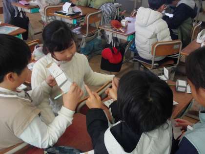 「この面と平行な面はどれかな?」「垂直なのはどの面だろう。」と、グループで模型を動かしながら話し合いました。