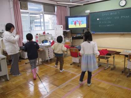 元町小学校のお友達と交流をしました。自己紹介をした後、一緒にダンスをしました。作ったおもちゃで一緒に遊んだのも楽しそうでした。