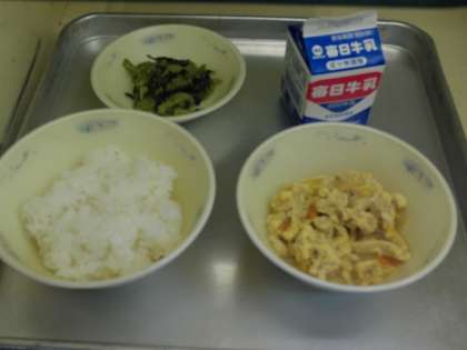 今日の献立は、ごはん・牛乳・あげたま煮・小松菜のごまいためです。